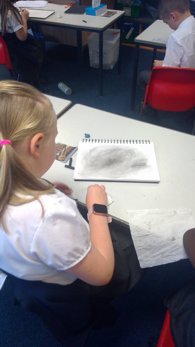 Art- Year 4 used charcoal to make a background. We crumbled some up, dropped it onto the page and got our fingers dirty spreading it out. We then used artist's putty to rub away the shapes we were observing. Fun. #stmicsart #kapowart