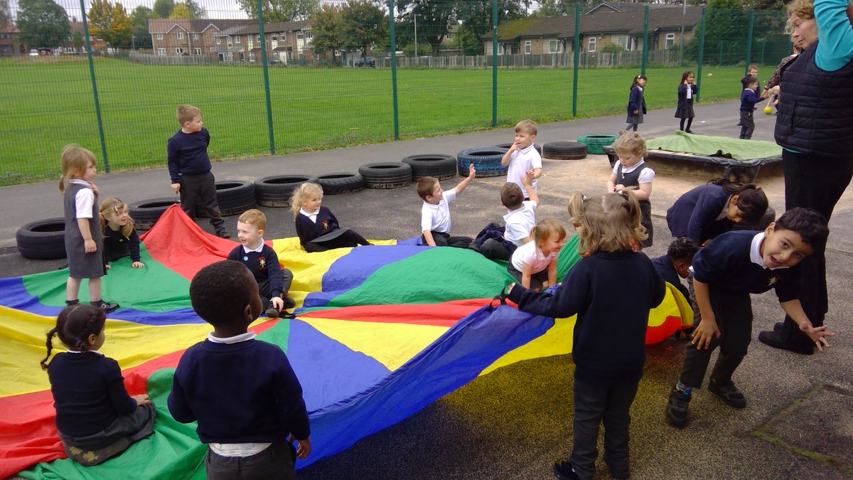 EYFS have been busy this week getting outside playing parachute games. @STOC_CAT #STMICEYFS